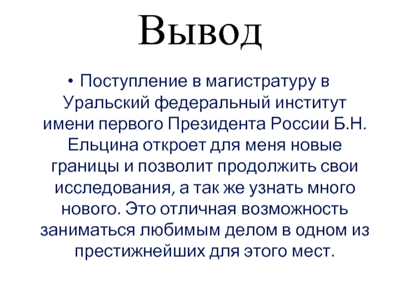 Я очень хочу продолжить научную деятельность по специальности химическая технология. А Уральский федеральный институт дает для этого прекрасную возможность. Так же предполагаю продолжить свое обучение в аспирантуре в дальнейшем.