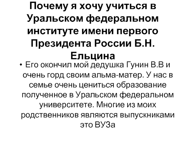 Его окончил мой дедушка Гунин В.В и очень горд своим альма-матер. У нас в семье очень цениться образование полученное в Уральском федеральном университете. Многие из моих родственников являются выпускниками это ВУЗа