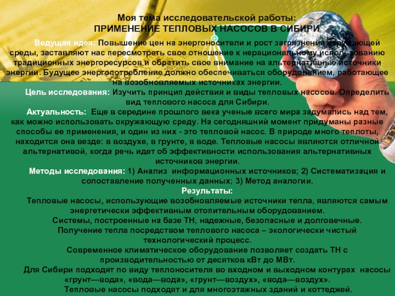 Актуальность: Еще в середине прошлого века ученые всего мира задумались над тем, как можно использовать окружающую среду. На сегодняшний момент придуманы разные способы ее применения, и один из них - это тепловой насос. В природе много теплоты, находится она везде: в воздухе, в грунте, в воде. Тепловые насосы являются отличной альтернативой, когда речь идет об эффективности использования альтернативных источников энергии.
