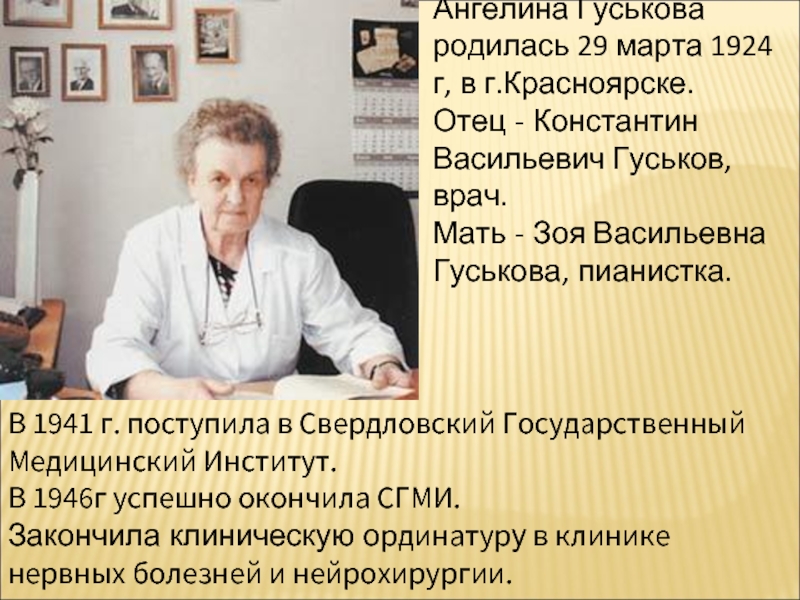 В 1949 г, в возрасте 25 лет, начала работать заведующей неврологическим отделением