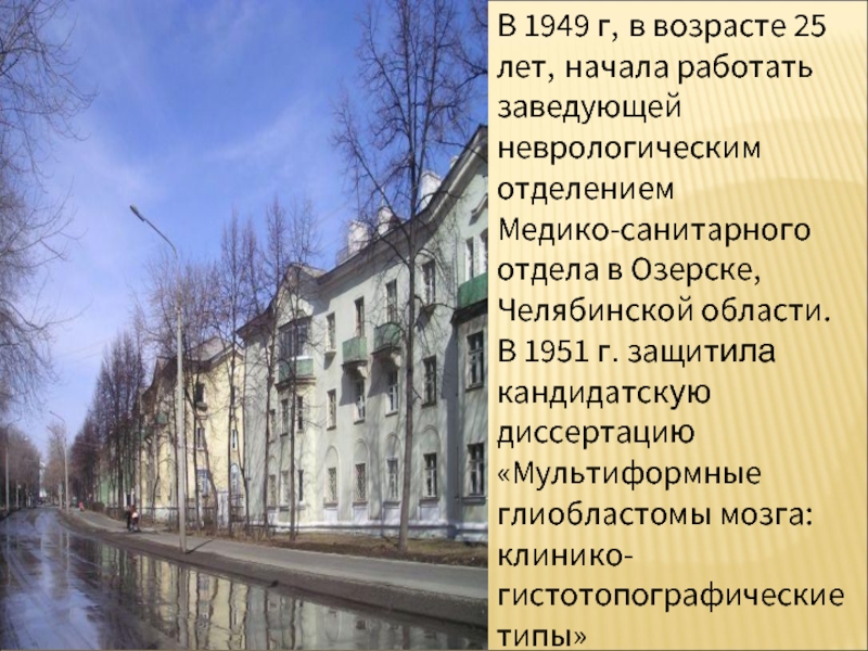 Медико-санитарного отдела в Озерске, Челябинской области. В 1951 г. защитила кандидатскую диссертацию «Мультиформные глиобластомы мозга: клинико-гистотопографические типы»