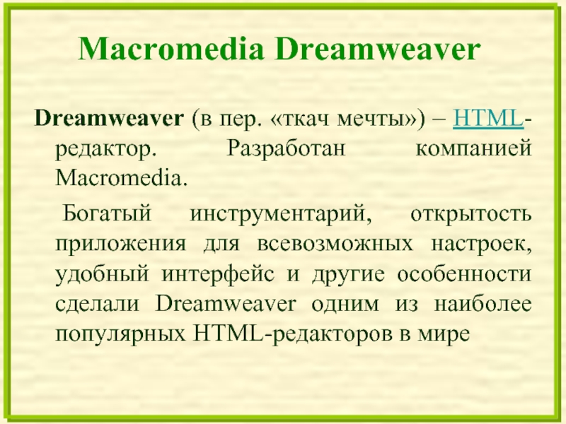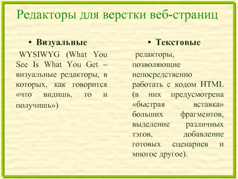 редакторы, позволяющие непосредственно работать с кодом HTML (в них предусмотрена «быстрая вставка» больших фрагментов, выделение различных тэгов, добавление готовых сценариев и многое другое).