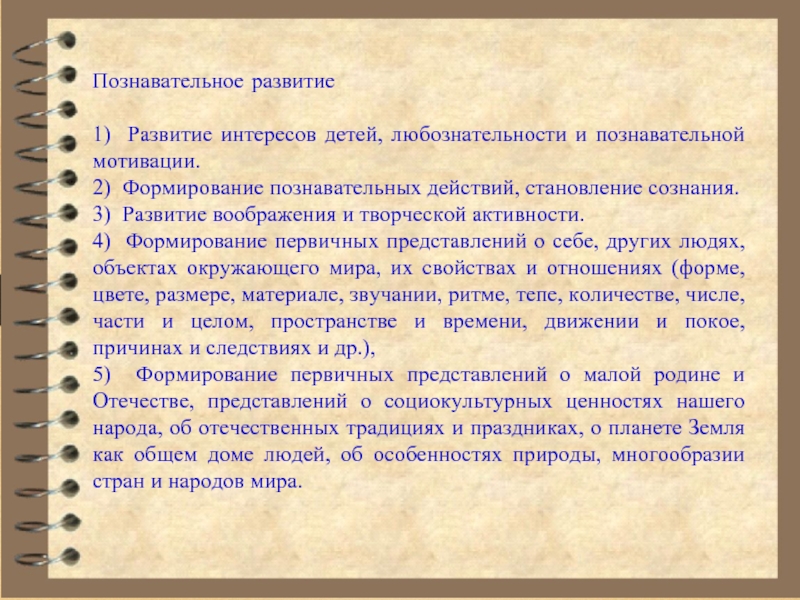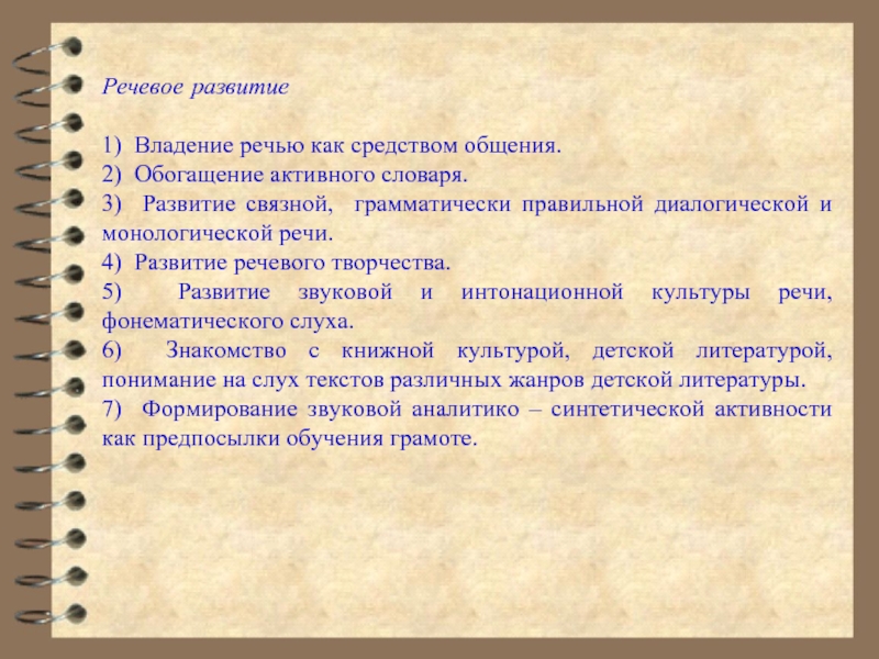 ребенок обладает развитым воображением, которое реализуется в разных видах деятельности, и прежде всего в игре; ребенок владеет разными формами и видами игры, различает условную и реальную ситуации, умеет подчиняться разным правилам и социальным нормам; ребенок достаточно хорошо владеет устной речью, может выражать свои мысли и желания, может использовать речь для выражения своих мыслей, чувств и желаний, построения речевого высказывания в ситуации общения, может выделять звуки в словах, у ребенка складываются предпосылки грамотности;