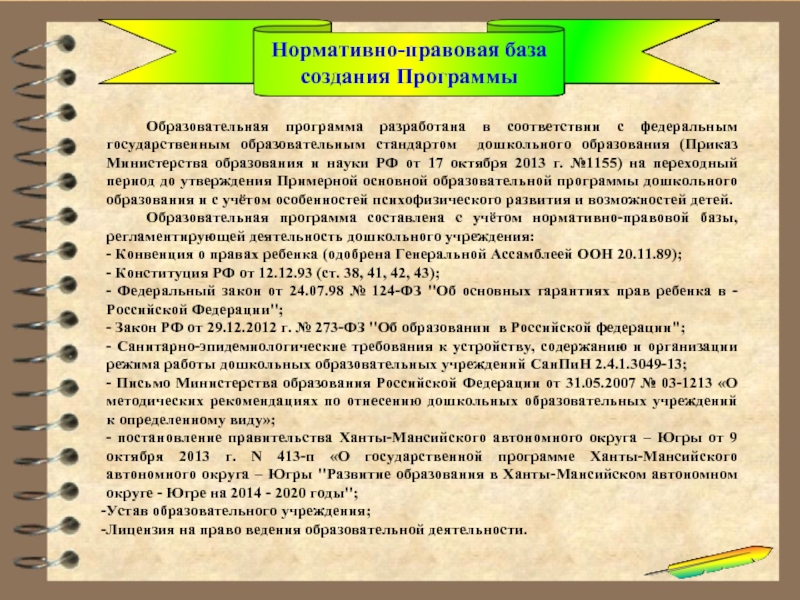 Образовательная программа составлена с учётом нормативно-правовой базы, регламентирующей деятельность дошкольного учреждения: