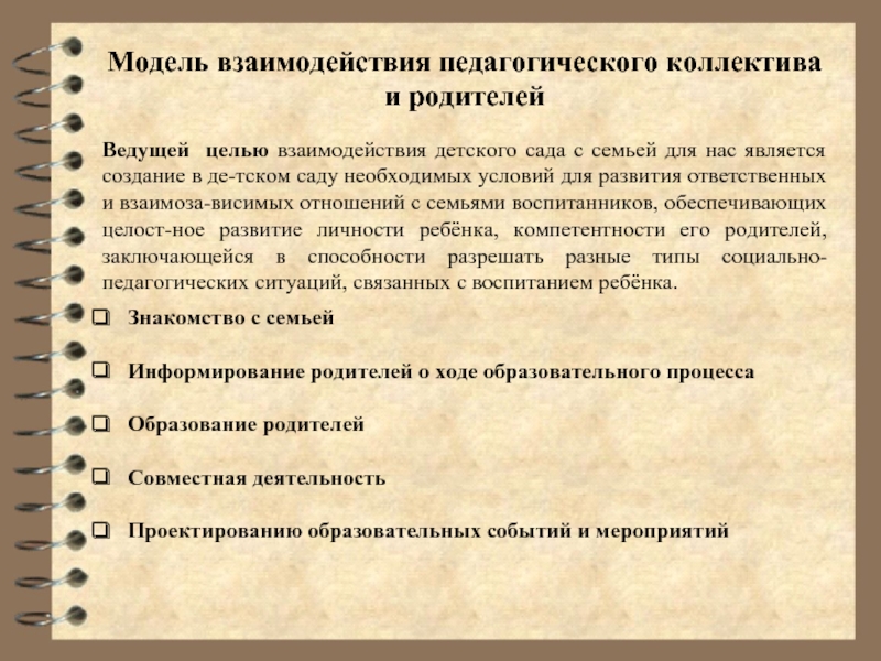 семьей для нас является создание в детском саду необходимых условий для развития ответственных и взаимозависимых отношений с семьями воспитанников, обеспечивающих целостное развитие личности ребёнка, компетентности его родителей, заключающейся в способности разрешать разные типы социально-педагогических ситуаций, связанных с воспитанием ребёнка.