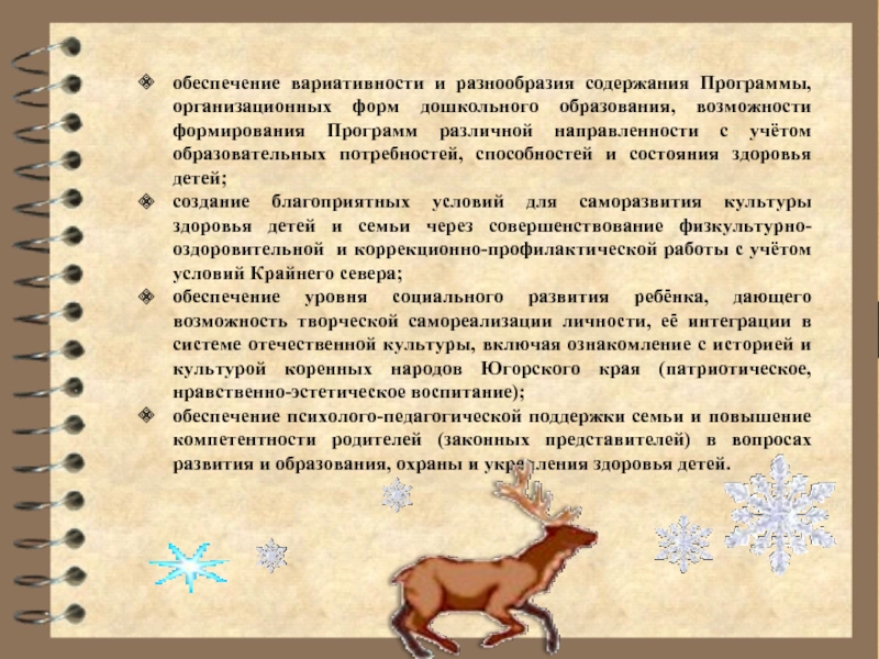 обеспечение уровня социального развития ребёнка, дающего возможность творческой самореализации личности, её интеграции в системе отечественной культуры, включая ознакомление с историей и культурой коренных народов Югорского края (патриотическое, нравственно-эстетическое воспитание);