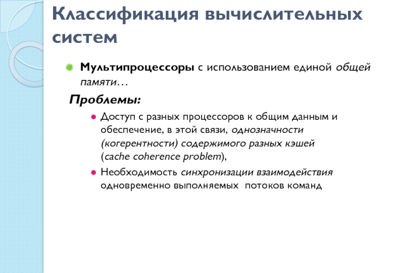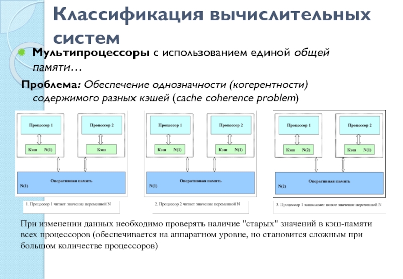 При изменении данных необходимо проверять наличие "старых" значений в кэш-памяти всех процессоров (обеспечивается на аппаратном уровне, но становится сложным при большом количестве процессоров)