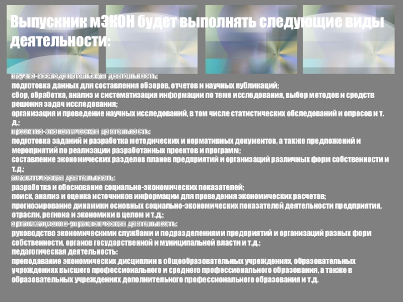 Выпускник мЭКОН будет выполнять следующие виды деятельности: