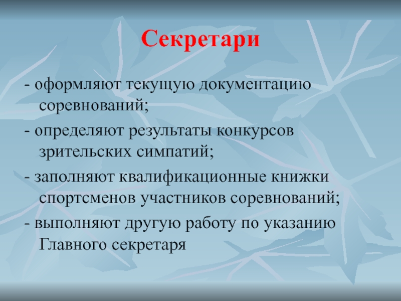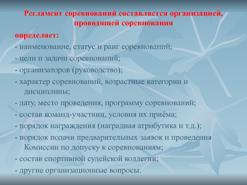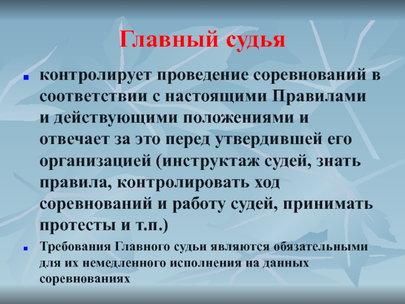 положениями и отвечает за это перед утвердившей его организацией (инструктаж судей, знать правила, контролировать ход соревнований и работу судей, принимать протесты и т.п.)