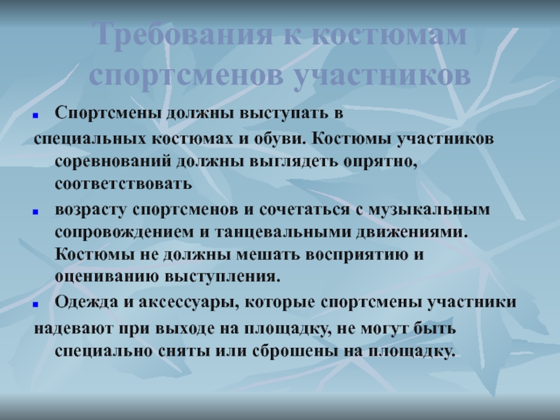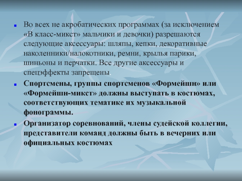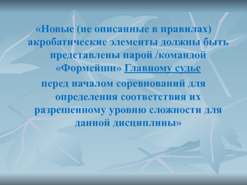 при выполнении полуакробатических и акробатических элементов и их комбинаций, бросков, ловли, сальтовых элементов