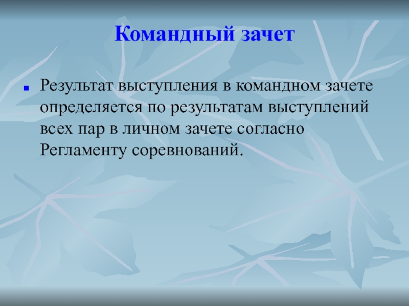 Результат выступления засчитывается отдельно каждой паре (личный зачёт).