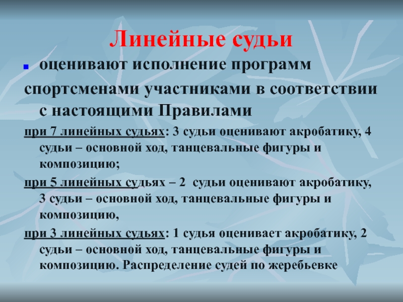 при 3 линейных судьях: 1 судья оценивает акробатику, 2 судьи – основной ход, танцевальные фигуры и композицию. Распределение судей по жеребьевке