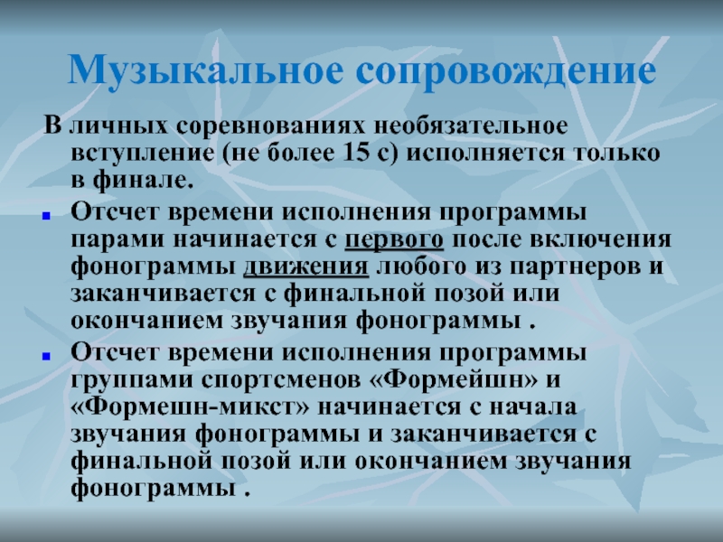 Отсчет времени исполнения программы группами спортсменов «Формейшн» и «Формешн-микст» начинается с начала звучания фонограммы и заканчивается с финальной позой или окончанием звучания фонограммы .