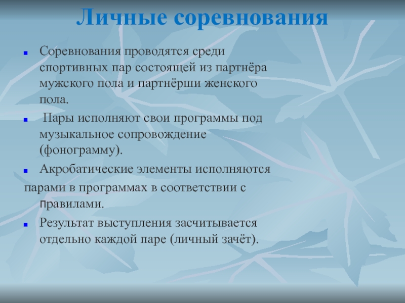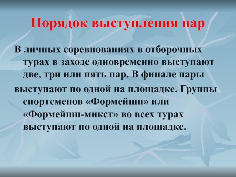 Пары исполняют свои программы под музыкальное сопровождение (фонограмму).