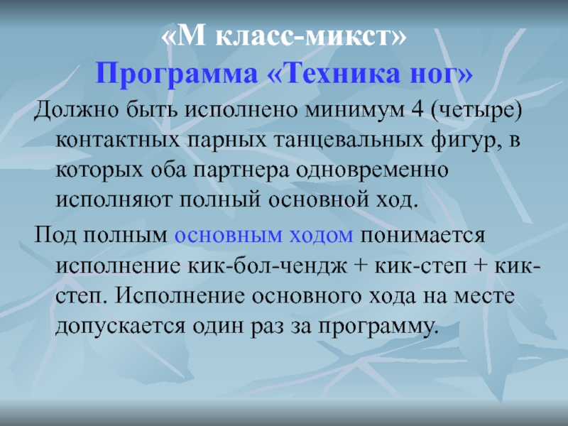 Под полным основным ходом понимается исполнение кик-бол-чендж + кик-степ + кик-степ. Исполнение основного хода на месте допускается один раз за программу.