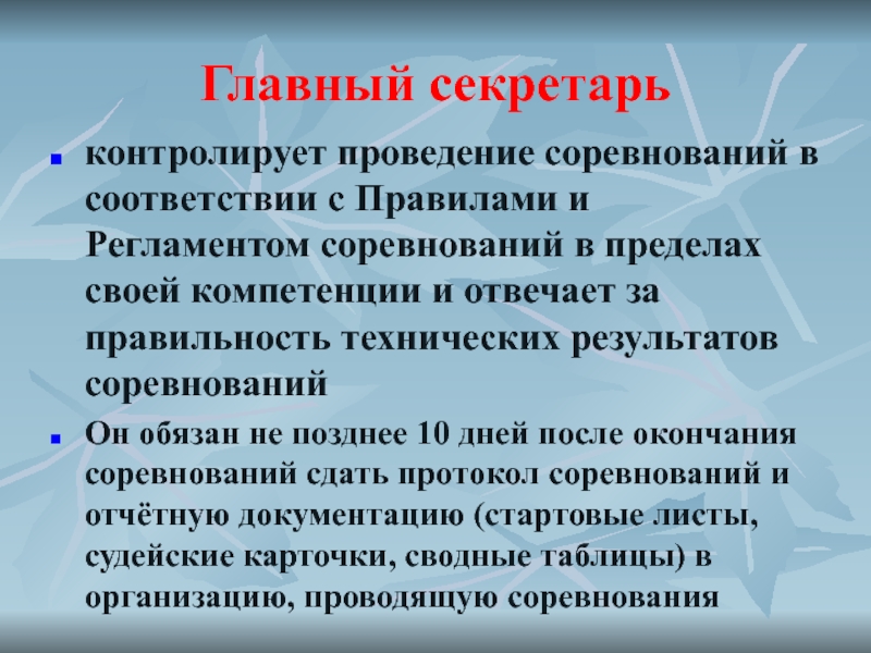 Он обязан не позднее 10 дней после окончания соревнований сдать протокол соревнований и отчётную документацию (стартовые листы, судейские карточки, сводные таблицы) в организацию, проводящую соревнования