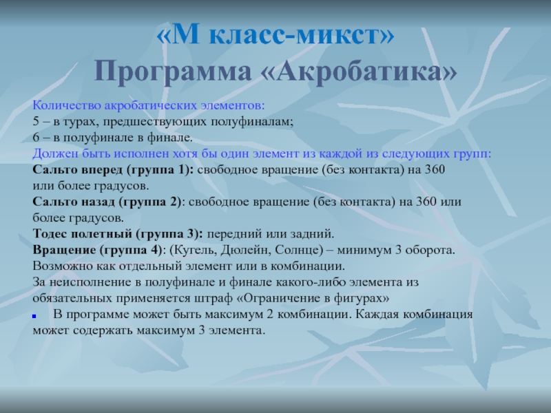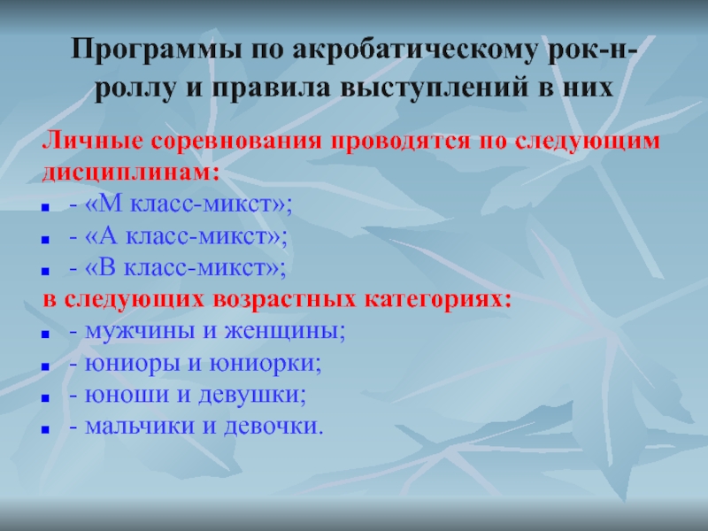 Слайд 6Программы по акробатическому рок-н-роллу и правила выступлений в них