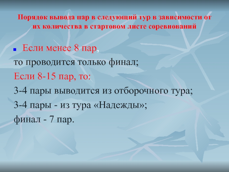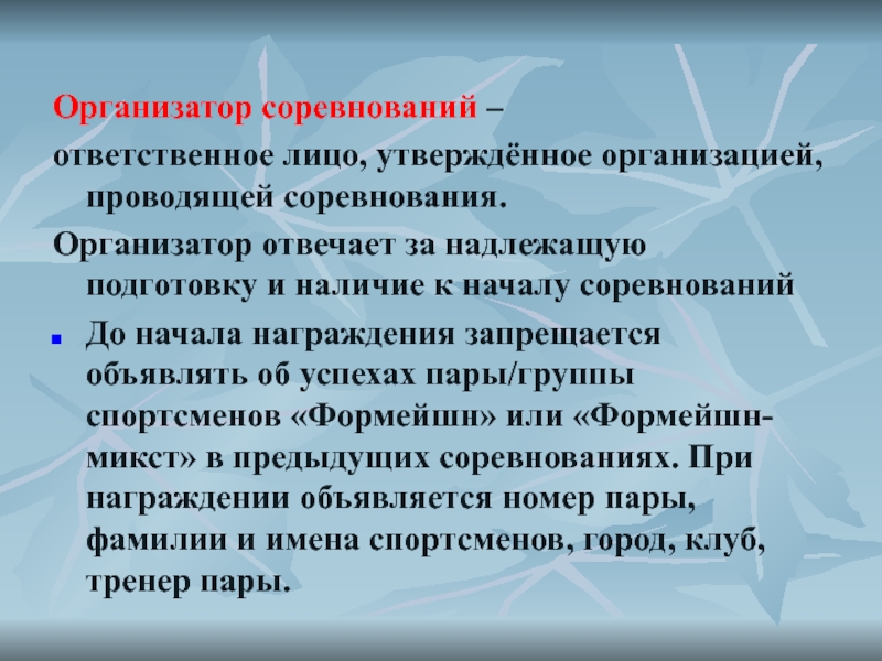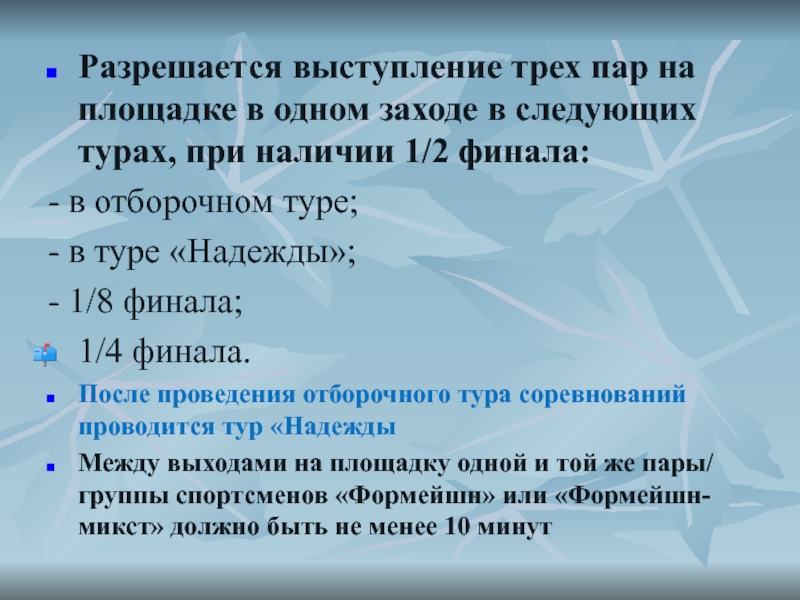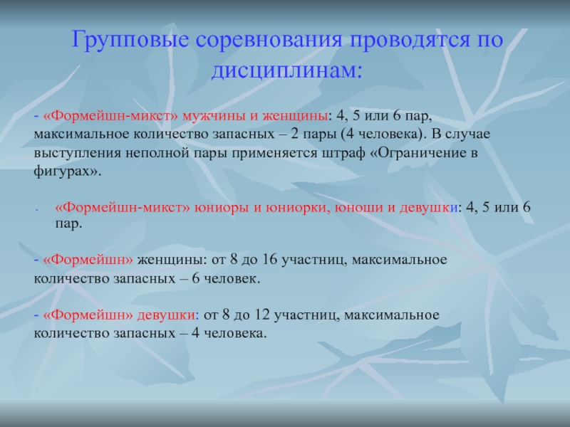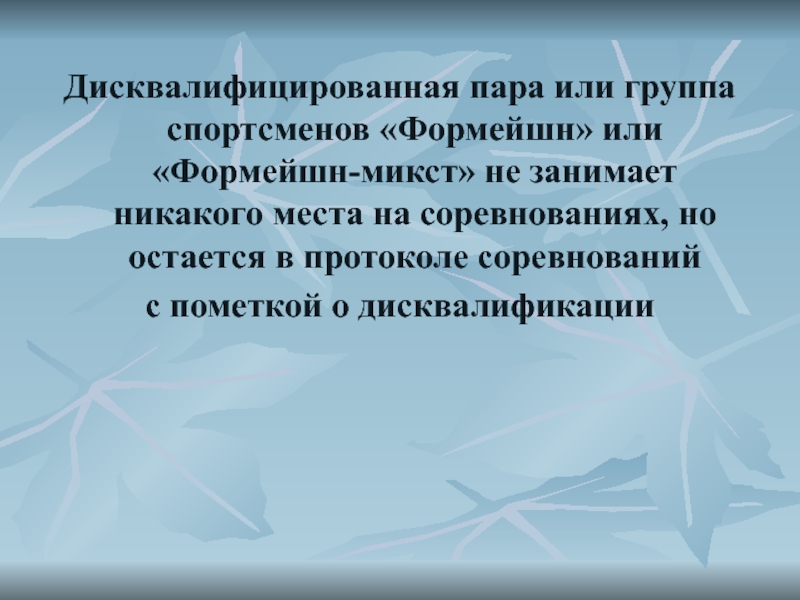 Слайд 40Дисквалифицированная пара или группа спортсменов «Формейшн» или «Формейшн-микст» не занимает никакого