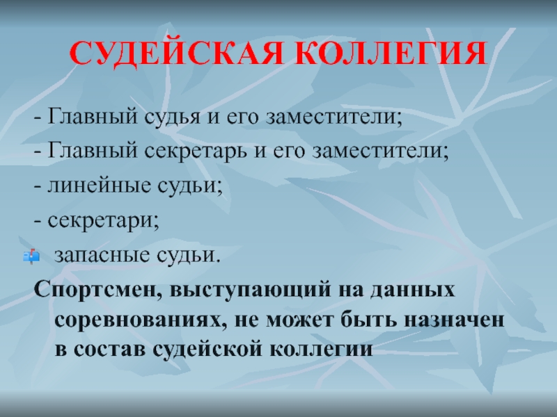 Спортсмен, выступающий на данных соревнованиях, не может быть назначен в состав судейской коллегии