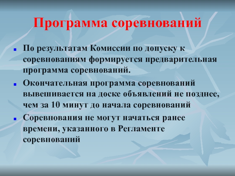 контролирует проведение соревнований в соответствии с настоящими Правилами и действующими
