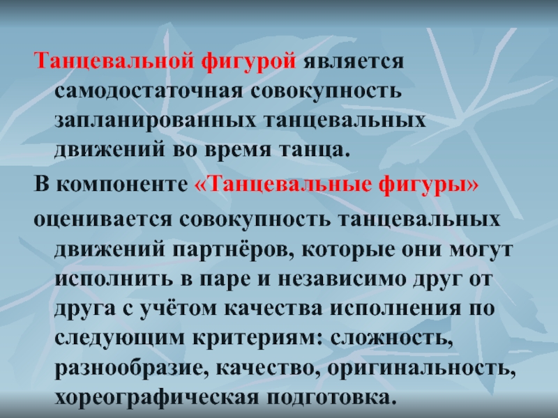 Слайд 46Танцевальной фигурой является самодостаточная совокупность запланированных танцевальных движений во время танца.