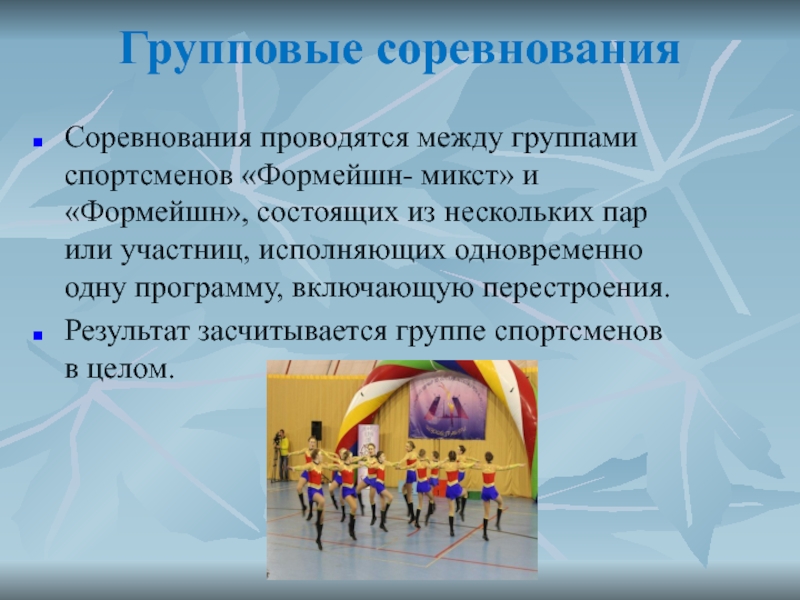 Соревнования проводятся между группами спортсменов «Формейшн- микст» и «Формейшн», состоящих