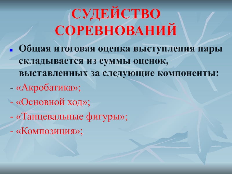 Общая итоговая оценка выступления пары складывается из суммы оценок, выставленных