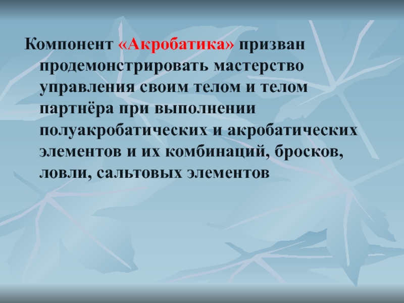 Слайд 42Компонент «Акробатика» призван продемонстрировать мастерство управления своим телом и телом партнёра