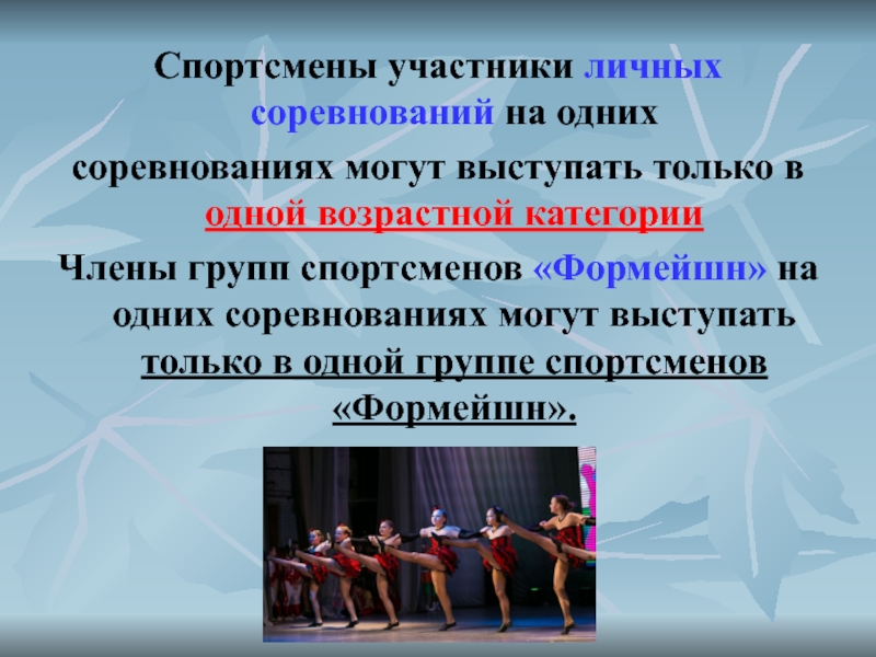 Члены групп спортсменов «Формейшн» на одних соревнованиях могут выступать только в одной группе спортсменов «Формейшн».