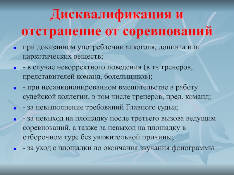 - за невыход на площадку после третьего вызова ведущим соревнований, а также за невыход на площадку в отборочном туре без уважительной причины;