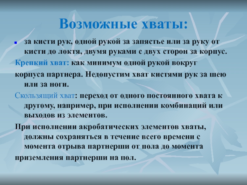 При исполнении акробатических элементов хваты, должны сохраняться в течение всего времени с момента отрыва партнерши от пола до момента