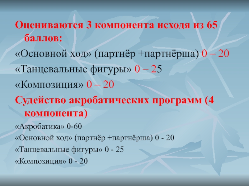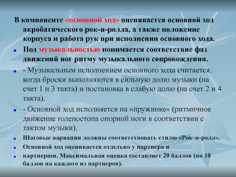 Слайд 45В компоненте «основной ход» оценивается основной ход акробатического рок-н-ролла, а также