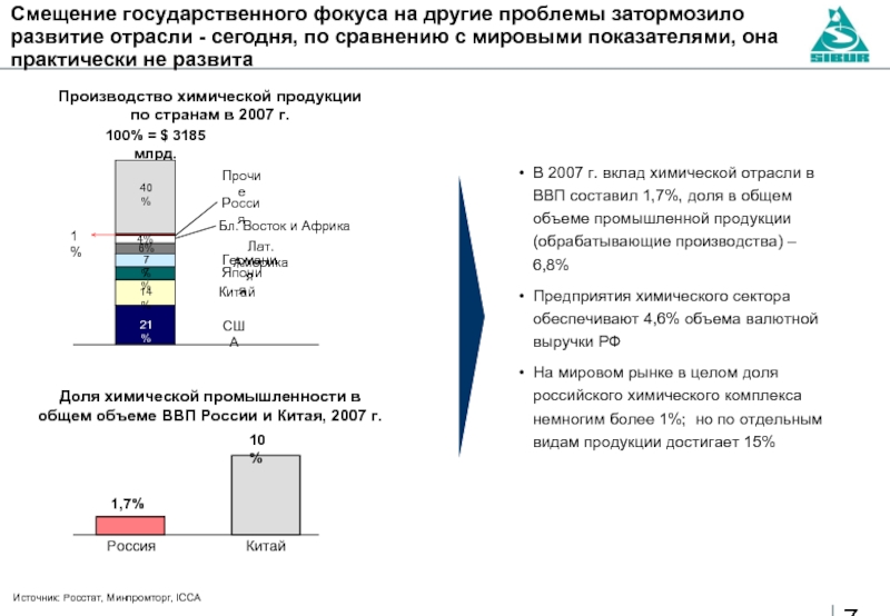 Доля химической промышленности в общем объеме ВВП России и Китая, 2007 г.