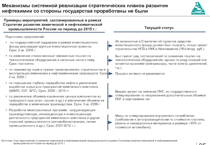 Примеры мероприятий, запланированных в рамках Стратегии развития химической и нефтехимической промышленности России на период до 2015 г.: