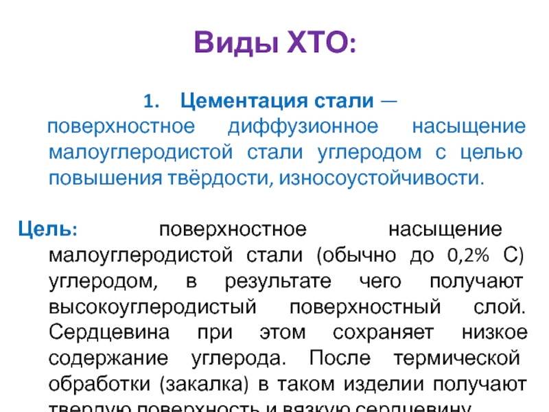 1. Диссоциация: распад молекул и образование активных атомов диффундирующего элемента, например 2СО → СО2 + С;