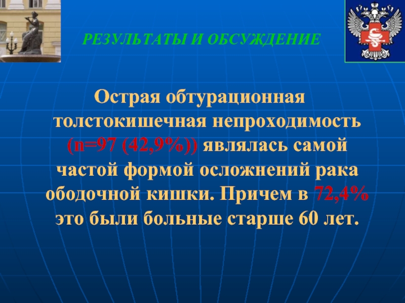 Острая обтурационная толстокишечная непроходимость (n=97 (42,9%)) являлась самой частой формой осложнений