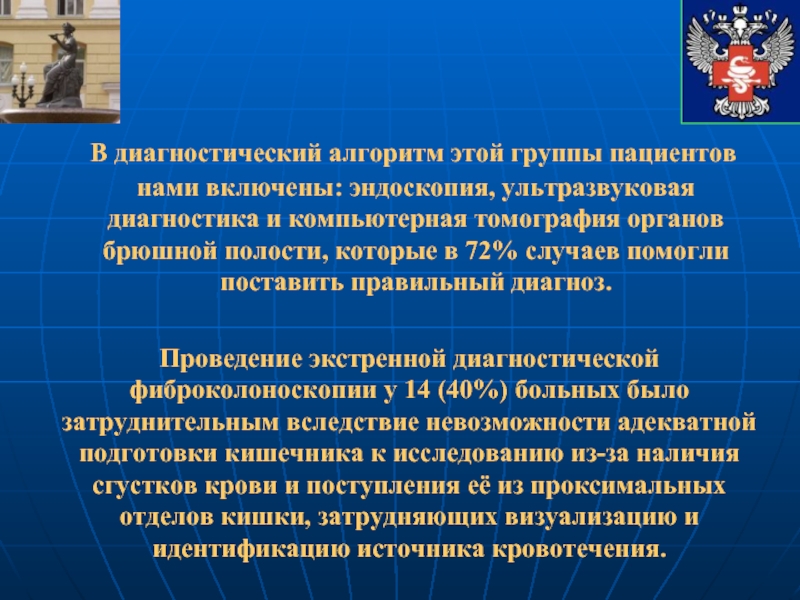 Слайд 52 В диагностический алгоритм этой группы пациентов нами включены: эндоскопия, ультразвуковая