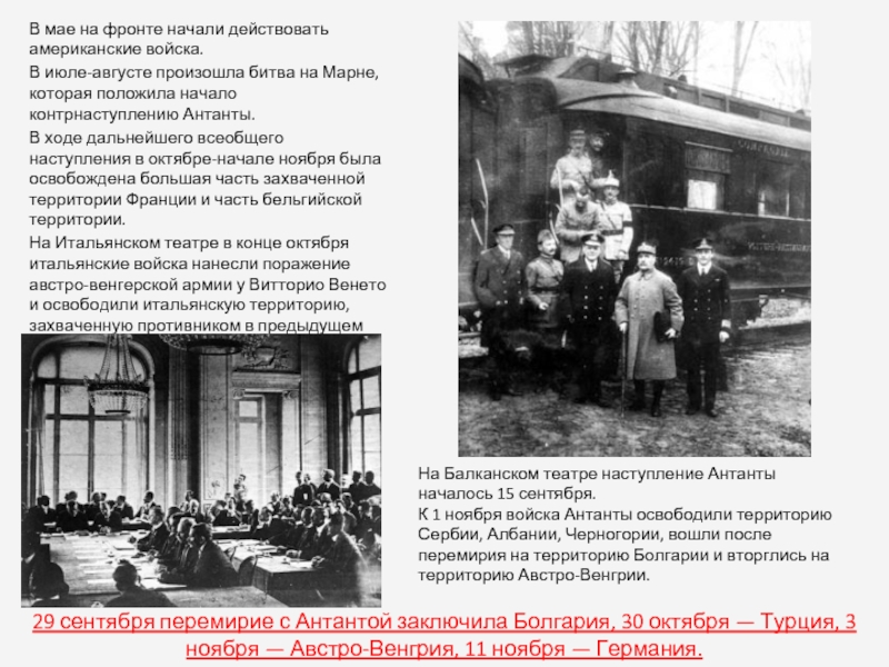 29 сентября перемирие с Антантой заключила Болгария, 30 октября — Турция, 3 ноября — Австро-Венгрия, 11 ноября — Германия.