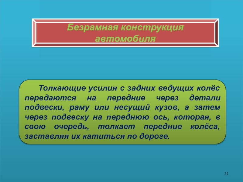 * иметь как можно более низкое расположение центра тяжести для обеспечения устойчивости автомобиля при движении на больших скоростях по закруглениями улиц и дорог, а также при движении на крупных подъёмах, спусках и по косогорам.