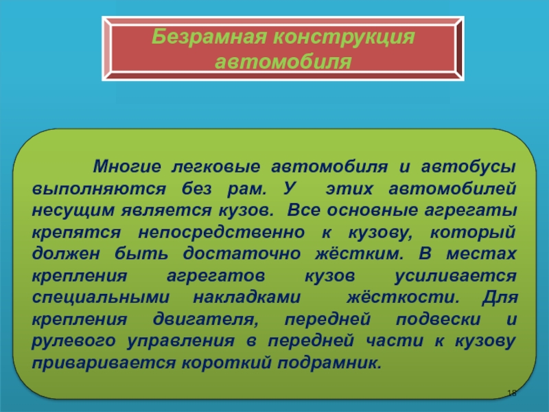 В США большое распространение получили рамные конструкции, которые позволяют широко варьировать модели кузовов и обеспечивают лучшую изоляцию кузова от вибрационных нагрузок.