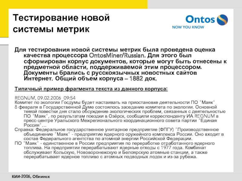 качества процессора OntosMiner/Russian. Для этого был сформирован корпус документов, которые могут быть отнесены к предметной области, поддерживаемой этим процессором. Документы брались с русскоязычных новостных сайтов Интернет. Общий объем корпуса – 1882 док.