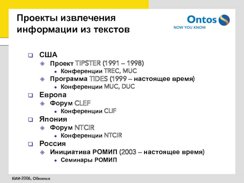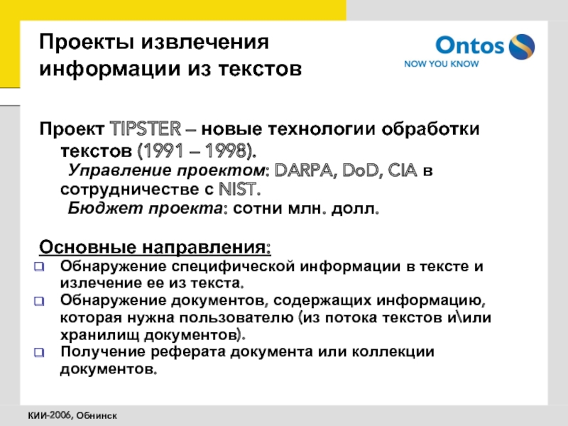 извлечения информации из текстов было положено исследованиями, которые проводились в 1991-1998 г.г. в рамках проекта TIPSTER.