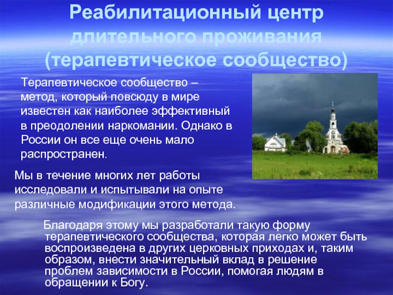такую форму терапевтического сообщества, которая легко может быть воспроизведена в других церковных приходах и, таким образом, внести значительный вклад в решение проблем зависимости в России, помогая людям в обращении к Богу.