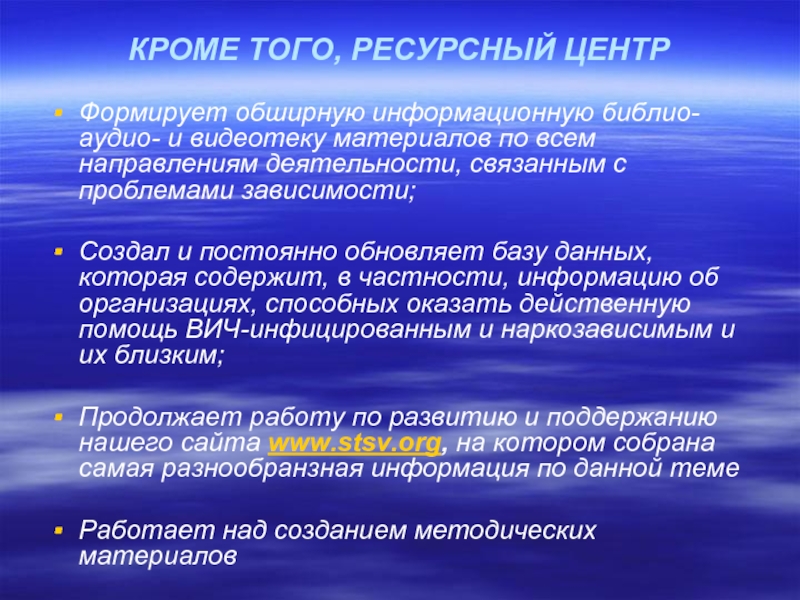 Создал и постоянно обновляет базу данных, которая содержит, в частности, информацию об организациях, способных оказать действенную помощь ВИЧ-инфицированным и наркозависимым и их близким;