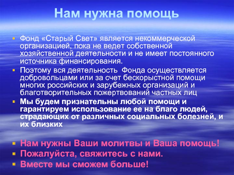 Мы будем признательны любой помощи и гарантируем использование ее на благо людей, страдающих от различных социальных болезней, и их близких