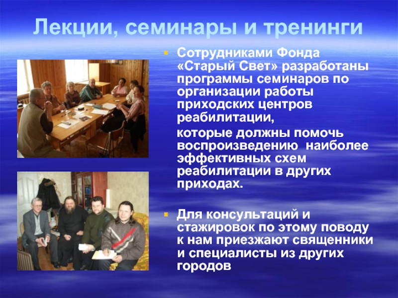 Регулярные семинары по проблемам зависимости для священнослужителей, врачей, психологов, социальных работников, сотрудников правоохранительных органов и т.д.
