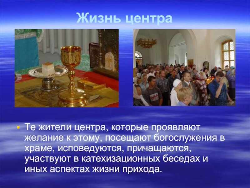 в храме, исповедуются, причащаются, участвуют в катехизационных беседах и иных аспектах жизни прихода.