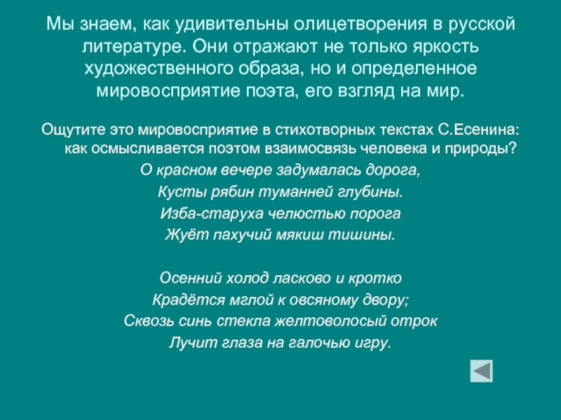 Ощутите это мировосприятие в стихотворных текстах С.Есенина: как осмысливается поэтом взаимосвязь человека и природы?