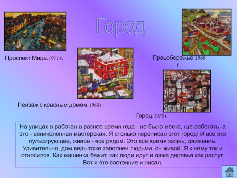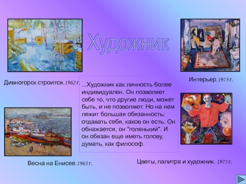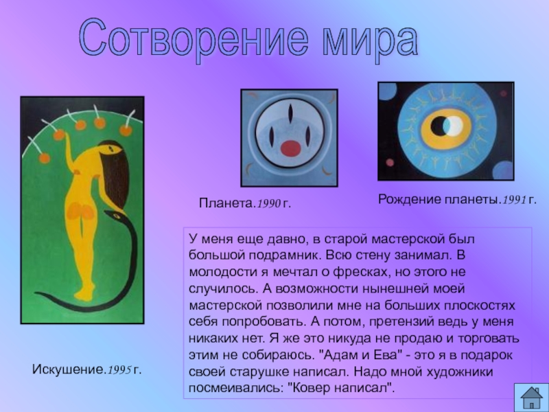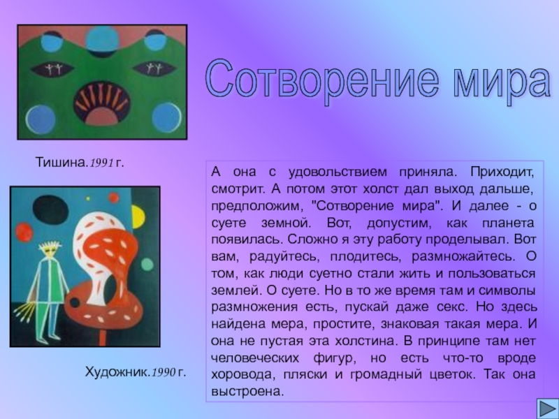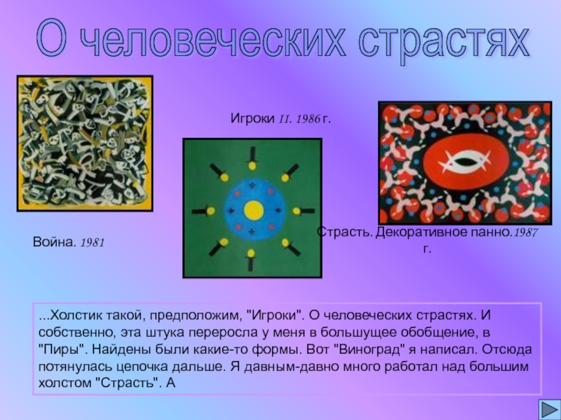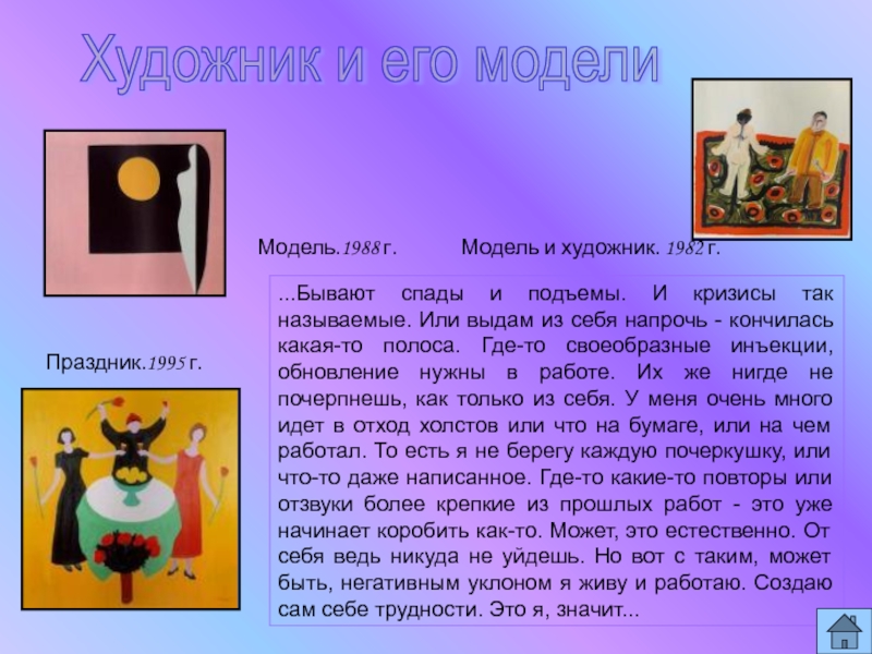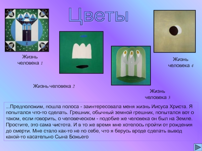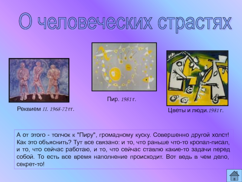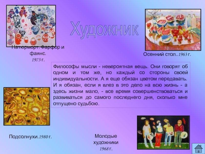 ...Цветы я всегда писал и люблю их. Это великолепное существо - цветы. Это живое существо, невероятно разное. Красота, прелесть, нежность. Я не могу от этого отказаться. А через цветы я могу увидеть другие сюжеты и несюжетные выходы. Это все страшно интересно, и это дает мне пищу для души. Энергию я от них получаю.