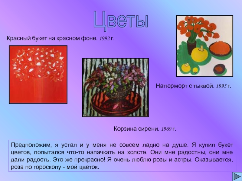 Предположим, я устал и у меня не совсем ладно на душе. Я купил букет цветов, попытался что-то напачкать на холсте. Они мне радостны, они мне дали радость. Это же прекрасно! Я очень люблю розы и астры. Оказывается, роза по гороскопу - мой цветок.